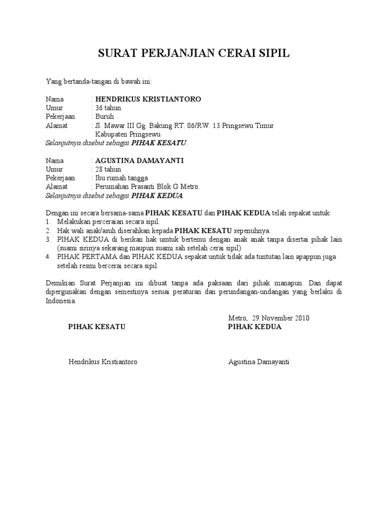 Surat pernyataan cerai adalah surat yang dibentuk oleh seorang suami dan juga sang istri yang isinya ialah untuk 4. Mba,mau tanya apakah surat perjanjian perceraian ini dpt dipatahkan atau dibatalkan pd saat sidang cerai nanti walaupun sdh di ttdtgn d atas materai dan ada saksi2nya.contohnya,misal dlm surat perjanjian itu kami sdh sepakat bhwa pengasuhan anak ada di saya ibunya,tp tiba2 dlm persidangan. Tujuannya tentu saja untuk proses perceraian. Download contoh surat perjanjian kerja, surat yang mengikat hubungan kedua belah pihak selama periode waktu kerja tertentu. 6th maret 2021 11 min read.